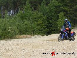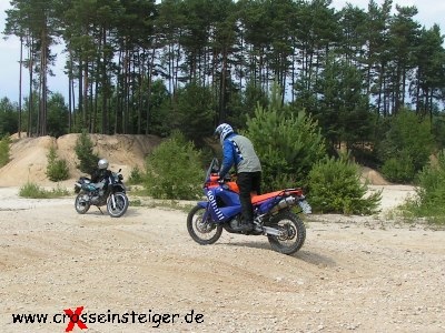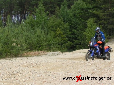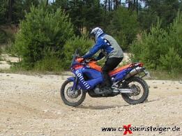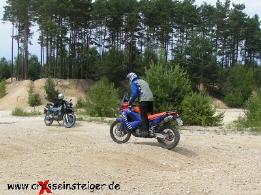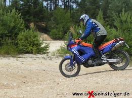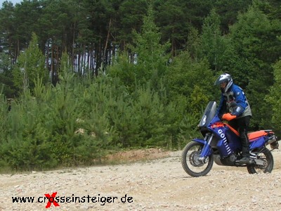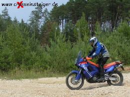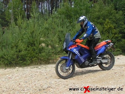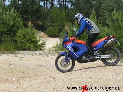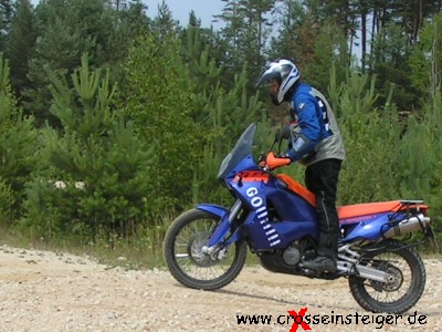 Reise, Enduro, Moto-Cross: Wellen sind im Prinzip zu fahren, wie Auf- und Abfahrten. Fahre die Wellen in der stehender Grundposition an. Knieschluß ist wichtig. Der Oberkörper sollte locker sein. Beuge die Arme und Knie leicht durch. Richte den Blick nach Vorne, mindestens über die erste Welle hinweg und fahre mit gleichmäßigem Gas an. Habe 2 Finger an der Kupplung um notfalls anhalten zu können. |