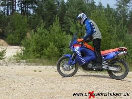 Geht es aufwärts, legst Du Deinen Oberkörper nach vorne. Wichtig dabei ist, daß Du die Gashand von Deinen Körperbewegungen entkoppelst. Manche Anfänger machen, wenn sie sich nach Vorne legen, das Gas zu. Halte das Gas gleichmäßig. Stütze Dich nicht auf den Lenker. |