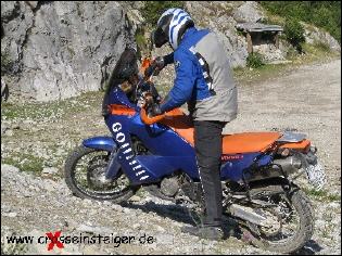 Es ist besser wenn Du etwas unterhalb des Motorrads stehst, dann kannst Du es besser halten. |