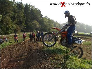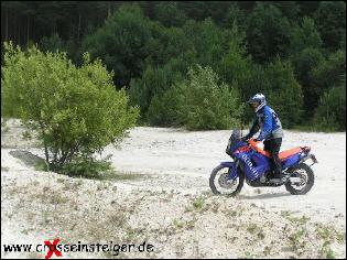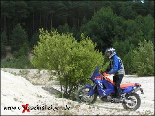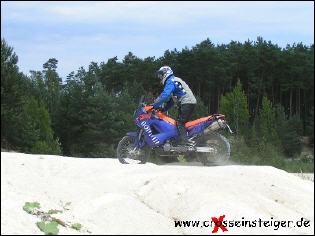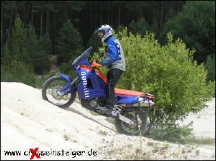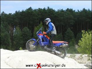 Sobald Dein Vorderrad durch die Kompression gefahren ist, solltest Du es belasten. Das machst Du, in dem Du den Oberkörper nach Vorne legst. Dabei solltest Du den Knieschluß nicht verlieren. Dein Blick richtet sich an das Ende der Auffahrt. Wichtig ist, gleichmäßig Gas zu geben. |