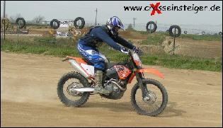 Beim Bremsen verlagert sich die Last auf das Vorderrad und das Hinterrad wird abgehoben. Du mußt das mit Deinem Körper ausgleichen. Dazu verlagerst Du Dein Gewicht auf das Hinterrad. - Die Knie sind an das Motorrad gepreßt. - Die Knie sind gebeugt, so kannst Du Unebenheiten ausgleichen. - Die Arme sind angewinkelt, damit Du „federn“ kannst. - Der Blick ist auf den Zielpunkt gerichtet. Dein Köpergewicht (Massenträgheit) wird soweit wie möglich durch die Knie am Motorrad abgefangen. Versuche Deine Arme dabei möglichst zu entlasten. Dadurch sparst Du Kraft. |