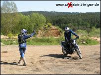 Enduro, Trial: Langsame Kurven im Stehen zur fahren, möglichst noch am Lenkanschlag, ist äußerst schwierig, kann aber einiges an Kraft sparen. Die dazugehörige Technik kommt aus dem Trial. Hier das Grundprinzip: |