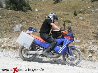 Reiseenduro: Bist Du gemütlich auf Reisen, wirst Du es sicherlich als zu viel Aufwand empfinden, bei kleineren Unebenheiten sofort in eine stehende Position über zu gehen. Außerdem sind Deine Hebel sicherlich so eingestellt, daß Du sie im Sitzen gut erreichen kannst. Im Stehen kommst Du dann kaum an die Fußbremse. |