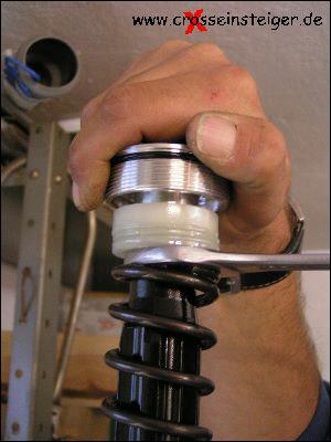 Die Gabelkappen von der Kolbenstange schrauben. Dazu hat die Kolbenstange einen Sechskantanschluß. Um an diesen zu kommen muß die Gabelfeder etwas nach unten gedrückt werden. Meist sind die Gewinde hier aus Aluminium. Daher vorsichtig vorgehen. |