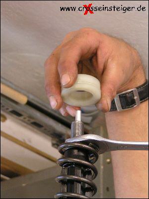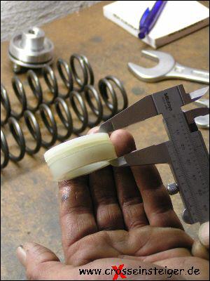 Die Vorspannung (Höhe der Hülsen) messen und notieren. Damit später wieder auf den ursprünglichen Zustand zurück gebaut werden kann, oder sich Rückschlüsse auf das Fahrverhalten anstellen lassen. |