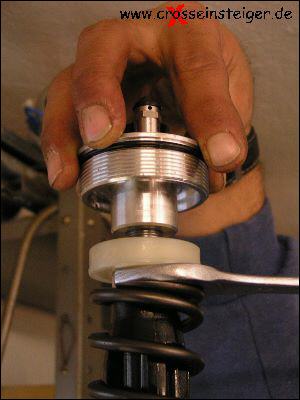 Die Kolbenstange etwas anheben und die Feder darauf setzten. |