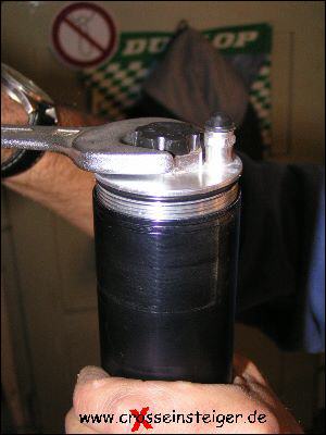 Einen Schlüssel auf die Kolbenstange, zwischen die Windungen der Feder setzen. Wenn man die Feder jetzt dreht, wandert die Kolbenstange nach oben (oder unten). |