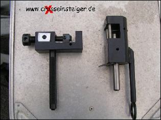 Zum Vernieten der Kette benötigst Du ein Nietwerkzeug. Hier siehst Du ein Set, links ein Werkzeug zum Aufpressen des Schlosses und rechts das eigentliche Nietwerkzeug. |