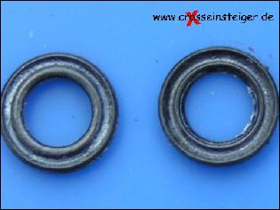 Bei manchen Ketten, haben die O-Ringe eine bestimmte Einbaurichtung. Sollte das bei Deiner neuen Kette so sein, steht das auf der Verpackung, oder einer Montageanleitung. Auf diesem Bild siehst Du den gleichen O-Ring von zwei verschiedenen Seiten. Deutlich zu erkennen ist der Unterschied am inneren Wulst. |