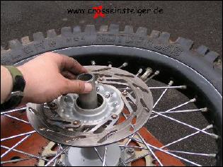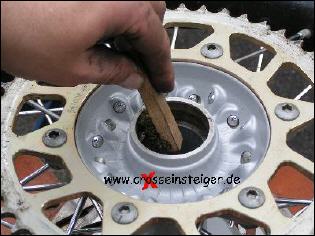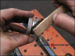 Das Lager legst Du flach auf die Nabe und „klöpfelst“ es mit Hilfe einer Nuß vorsichtig hinein. Optimal wäre es, wenn die Nuß die gleiche Größe hat, wie der äußere Ring des Radlagers (jedoch kleiner als die Nabe). Hast Du eine solche Nuß nicht, nimm die größte, die Du hast und sorge dafür, daß diese nur auf den Rand des Radlagers drückt. Rundum klopfen, keine Gewalt anwenden. Das Lager muß leicht hinein gehen und nach dem Abkühlen der Nabe fest sitzen (wenn nicht, siehe unten). |