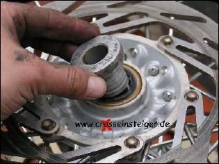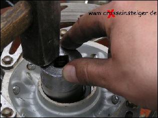 Lager flach auflegen und eintreiben. Dabei so vorgehen, wie auf der anderen Seite. Das Lager nur leicht an die Distanzhülse anlegen. |