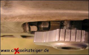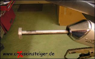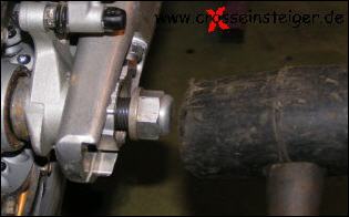 Die Achse soweit herausziehen, dass Sie vor den Kettenspanner geschoben werden kann. Auf der Mutternseite wird der Kettenspanner einfach heraus genommen. |