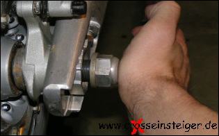 Gut gefettete Achsen lassen sich mit der Hand aus dem Rad drücken. Die nicht komplett demontierte Achsmutter schont dabei die Hand. |
