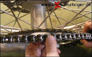 Die Kette kann jetzt vom Kettenblatt genommen werden. Anschließend Achse komplett entfernen und Rad heraus nehmen. |