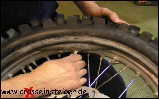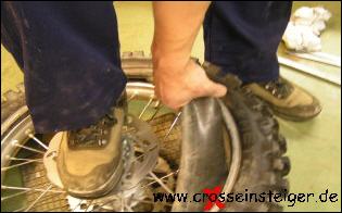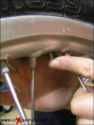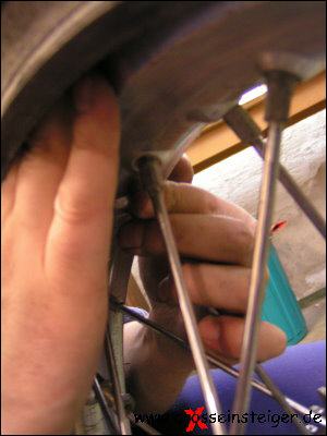 Am Ventil mit einer Hand zwischen Felge und Schlauch greifen und mit der zweiten Hand das Ventil durch die Felge drücken.
