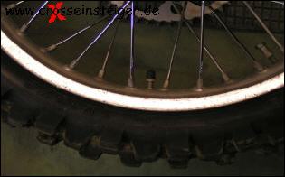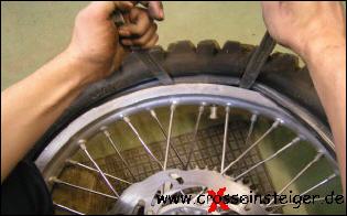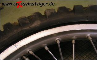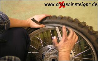Der Reifen muss, wie auf dem Bild zu sehen, so tief wie möglich im Felgenbett liegen, ansonsten lässt sich der letzte Abschnitt äußerst schwer montieren.