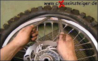 Den ersten Hebel heraus ziehen und neu ansetzen. Den Reifen während des kompletten Montagevorgangs tief in das Felgenbett drücken.