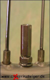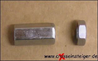 Die gezeigte Lösung besteht aus einer Gewindemuffe M8x30mm mit einer Schlüsselweite von 11mm. Die Muffe wird einseitig mit Silikon verschlossen und dann gegen eine normale Mutter M8 (Schlüsselweite 13mm) gekontert, so dass sich der Halter nicht lockern kann. Durch das geringere Maß der Muffe kann ein 13er Ringschlüssel ohne Probleme über die Muffe gezogen werden. Ein weiterer Vorteil besteht darin, dass das Gewinde des Halters durch die Muffe gegen Beschädigungen, wie z.B. Steinschlag, geschützt wird. |
