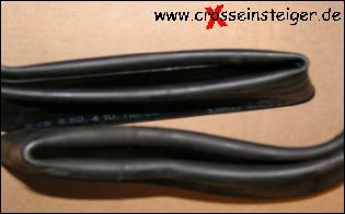 Enduro, Moto-Cross, Trial: Verstärkte Schläuche bieten einen höheren Schutz gegen Durchschlagen. Der obere Schlauch im Bild hat eine normale stärke. Unten sieht man den etwa 1/3 dickeren verstärkten Schlauch. Den gleichen Effekt kann man erreichen, indem man zwei Schläuche montiert. Dazu schlitzt man einen alten Schlauch an der Innenseite auf, entfernt das Ventil und legt ihn um den zweiten Schlauch. |