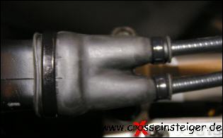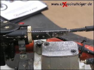 Enduro, Moto-Cross, Trial: Wird an der Hülse des Gasseils gezogen, kann es passieren, dass sich das Hülsenende auf das Gehäuse des Gaszugs oder der Vergasereinführung stellt. Das sorgt dafür, dass das Gasseil gespannt wird und das Motorrad ungewollt beschleunigt. Das linke Bild zeigt eine Zugentlastung die das verhindern kann. Nach dem gleichen Prinzip kann die Einführung in den Vergaser gesichert werden. |