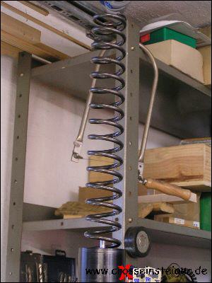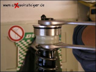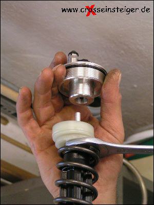 Zum Ansetzen eines Schlüssels an der Kolbenstange mußt Du die Feder etwas herunter drücken. Dann mit einem zweiten Schlüssel an der Kappe die Kappe lösen. |