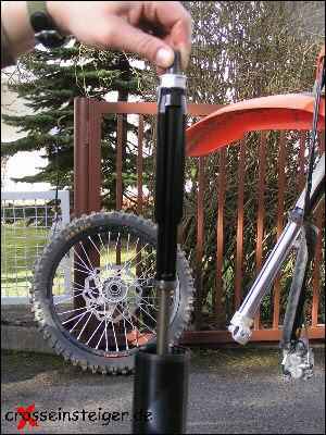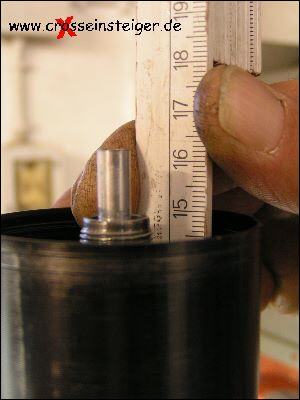 Der Ölstand der Gabel, hat Einfluß auf die Progression. Daher solltest Du jetzt messen, wieviel Öl in der Gabel ist, damit Du später die gleiche Menge wieder einfüllen kannst. Stecke einen sauberen Zollstock senkrecht in die Gabel bis die Oberkante des Außenrohrs mit 15cm fluchtet. |