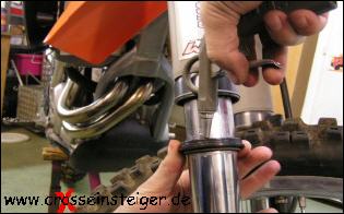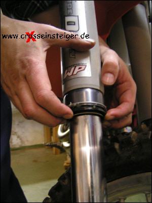 9. Den Abstreifer in das Gabelrohr eindrücken. Dabei darauf achten, dass der Abstreifer komplett eingepresst ist. |