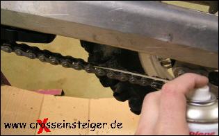 Enduro, Moto-Cross, Trial: Ketten schmiert man am besten „innen“ und dreht dabei gleichzeitig das Hinterrad, so dass das Öl durch die Zentrifugalkraft nach Außen in die Kette getrieben wird.
