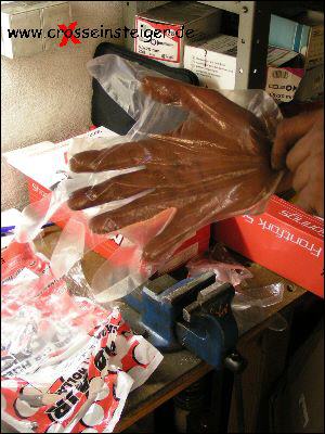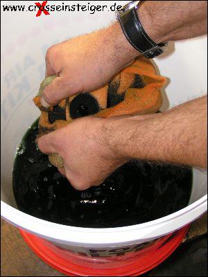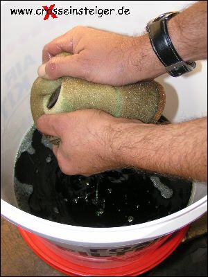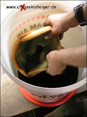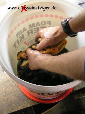 Den Luftfilter jetzt im Reiniger einweichen. Je nach Verschmutzung muß der Reiniger etwas einwirken. |
