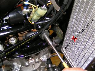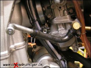 Bevor Du mit der eigentlichen Arbeit beginnen kannst, muß das Motorrad absolut sauber und trocken sein, damit kein Dreck oder Wasser in den geöffneten Motor kommen kann. Insbesondere der Zylinderkopf und der Bereich darüber müssen gesäubert werden. Dazu mußt Du beim Waschen den Tank abnehmen. Es empfiehlt sich ein Rundstück in den Benzinschlauch zu stecken, damit nichts in den Vergaser kommen kann. |