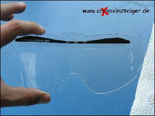 Enduro, Moto-Cross: Brillengläser können gegen Anlaufen geschützt werden. Dazu Spülmittel auf die Innenseite der Scheibe geben und mit einem weichen Tuch verreiben. Wenn Du ein Roll-Off einsetzen möchtest, achte darauf, daß kein Spülmittel auf die Außenseite der Scheibe kommt.