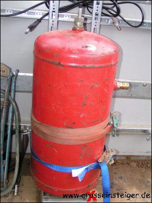 Enduro, Moto-Cross, Trail: Druckluft an der Strecke ist eine tolle Sache. Z.B. können Reifen schnell gefüllt und Vergaser einfach gesäubert werden. Für diesen Luxus benötigt man normalerweise einen Kompressor und einen Stromgenerator. Günstiger und leichter geht es mit einem Drucklufttank. In diesem Beispiel haben wir einen Tank aus einer Bremsanlage eines ausgedienten Lkw´s verwendet. Bekommen kann man so etwas bei Schrotthändlern oder LKW-Werkstätten. |