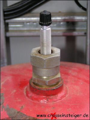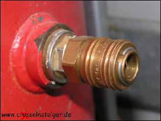 Zum Befüllen wurde ein Ventilanschluß montiert, damit wir auf mehrtägigen Touren auch notfalls an einer Tankstelle unseren Vorrat an Pressluft auffrischen können. |