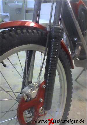 Hier wurde ein dicker Schlauch aufgeschnitten und mit Kabelbindern an der Gabel befestigt. |