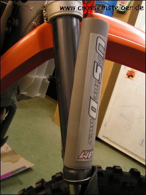 Steinschläge von vorausfahrenden Motorrädern können die Gabelholme beschädigen. Dagegen kann man die Holme mit einem, der Länge nach aufgesägtem HT-Kunststoffrohr schützen. Diese Rohre bekommt man im Baumarkt oder beim Installateur. Der Rohrdurchmesser wird so gewählt, dass das Rohr straff auf die Gabel geklippst werden kann. |