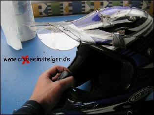 Enduro, Moto-Cross, Trail: Bei Regenfahrten kann die Brille etwas gegen Tropfen geschützt werden, wenn man das Helmschild verlängert. Ein altes Brillenglas ist ideal.