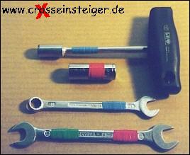 Unterschiedliche Farbmarkierungen am Werkzeug erleichtern das Auffinden der richtigen Schlüsselweite in der Werkzeugkiste.