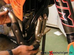 Bei der Montage von Auspuffanlagen ist es wichtig, in der Montagerichtung von Vorne nach Hinten zu arbeiten. Weiterhin muß die Anlage spannungsfrei befestigt werden. Diese Anlage (Leo Vince) hat einen Mehrteiligen Krümmer um den Abgasstrom optimaler zu leiten. Auf diesem Bild sind die beiden ersten Teile locker auf die Zylinderauslässe gesteckt. |