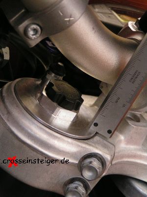 Den Überstand der Gabel an der Brücke messen und aufschreiben. Der Überstand beeinflußt den Geradeauslauf entscheidend, deshalb ist es wichtig, daß der aktuelle Wert erfaßt wird, damit das Motorrad später genau so wieder zusammen gebaut werden kann. |
