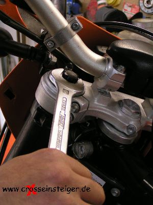 Die oberen Klemmschrauben der Gabelbrücke lösen. Die unteren Schrauben der Brücke noch nicht lösen, da… |