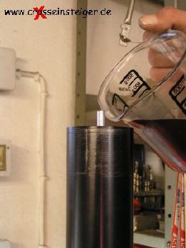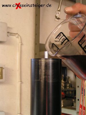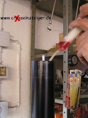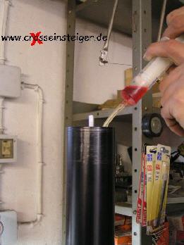 Dann den Stock heraus ziehen und den Ölstand ablesen. Hier sind es 3cm. Dh. 15-3=12cm Luftkammer. |