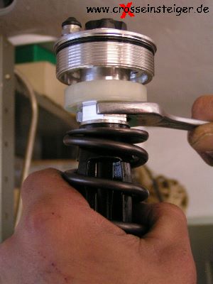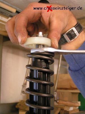 Einen Schlüssel auf die Kolbenstange, zwischen die Windungen der Feder setzen. Wenn man die Feder jetzt dreht, wandert die Kolbenstange nach oben (oder unten). |