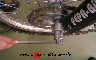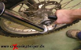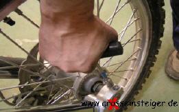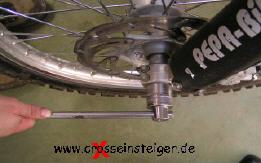 Bei der Vorderradmontage ist es wichtig, daß die Gabel nicht verspann montiert wird. Dazu die Achse einstecken und die Klemmfaust gegenüber der Achsmutter anziehen. |