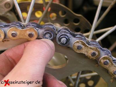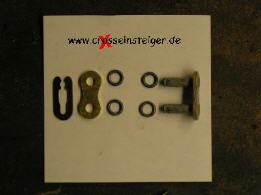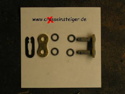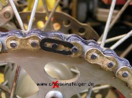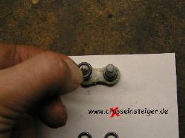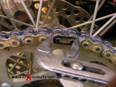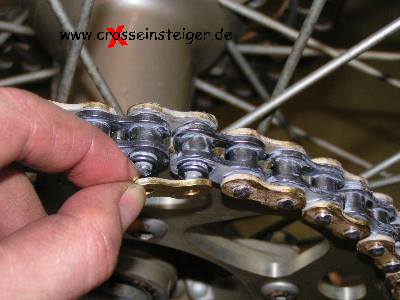 Dann den Clip in Position bringen. Dabei ist wichtig, daß die geschlossene Seite des Clips in die Laufrichtung der Kette zeigt. Oder mit anderen Worten, der Clip darf nicht mit der offenen Seite zuerst durch die Kettenführungen laufen, da er sich sonst lösen könnte. |