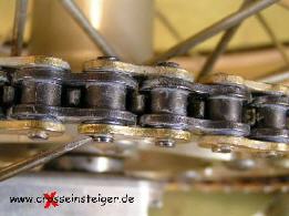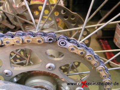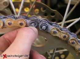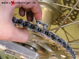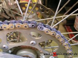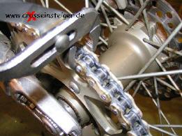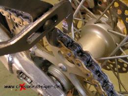 Da die neue Kette noch nicht gelängt ist, wird diese kürzer sein, als die Alte. Daher Achsmuttern und beidseitig Kettenspanner lösen und… |