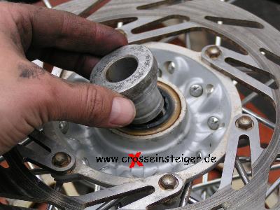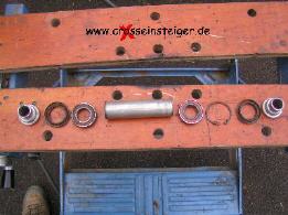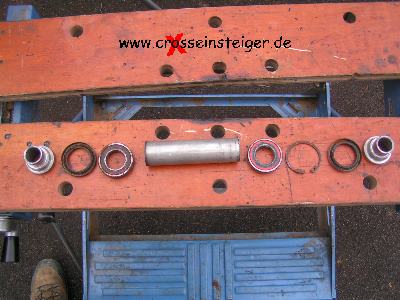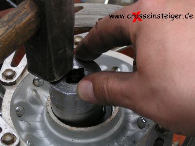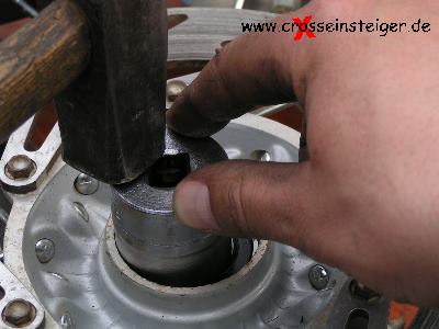 Lager flach auflegen und eintreiben. Dabei so vorgehen, wie auf der anderen Seite. Das Lager nur leicht an die Distanzhülse anlegen. |