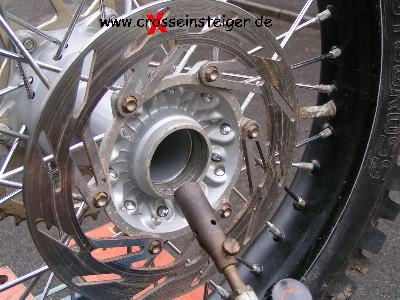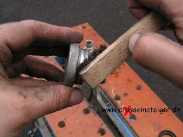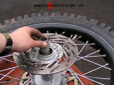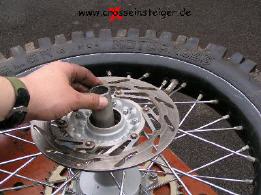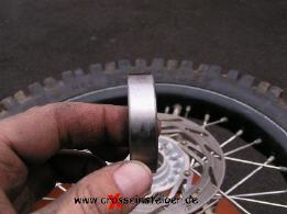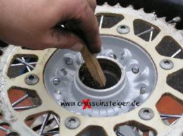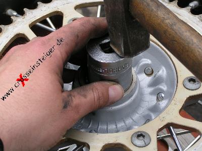 Das Lager legst Du flach auf die Nabe und „klöpfelst“ es mit Hilfe einer Nuß vorsichtig hinein. Optimal wäre es, wenn die Nuß die gleiche Größe hat, wie der äußere Ring des Radlagers (jedoch kleiner als die Nabe). Hast Du eine solche Nuß nicht, nimm die größte, die Du hast und sorge dafür, daß diese nur auf den Rand des Radlagers drückt. Rundum klopfen, keine Gewalt anwenden. Das Lager muß leicht hinein gehen und nach dem Abkühlen der Nabe fest sitzen (wenn nicht, siehe unten). |