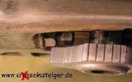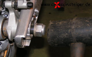 Zum Radausbau die Achsmutter lösen. Damit das Gewinde der Achse nicht beschädigt wird, die Mutter nicht komplett abschrauben, sondern etwas stehen lassen. Dann auf den Mutternkopf schlagen. Die Verwendung eines Gummihammers schont die Mutter. |