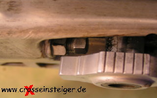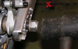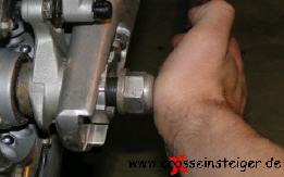 Die Achse soweit herausziehen, dass Sie vor den Kettenspanner geschoben werden kann. Auf der Mutternseite wird der Kettenspanner einfach heraus genommen. |