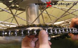 Die Kette kann jetzt vom Kettenblatt genommen werden. Anschließend Achse komplett entfernen und Rad heraus nehmen. |